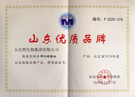 近日,大自然生物集團有限公司收到由山東省質量評價協會頒發的榮譽證書,公司的檸檬酸鈉產品榮獲“山東優質品牌”稱號。